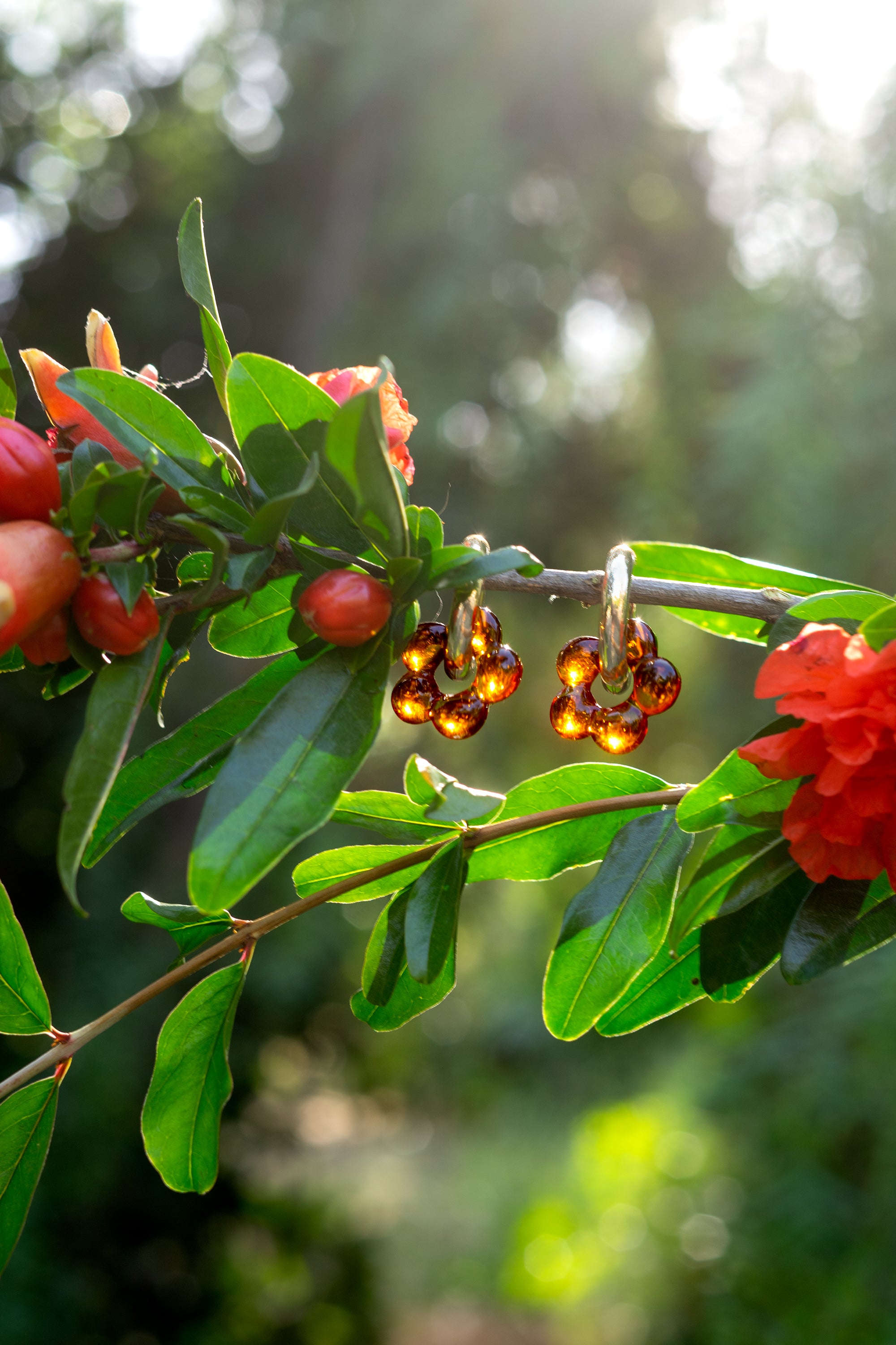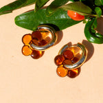 Introducing the Dazy Glaze hoops in amber. Featuring a lamp work glass flower centerpiece set on a 18k gold-plated hoop, these earrings will add a hint of cute and romantic vibes to whatever you decide to pair up.